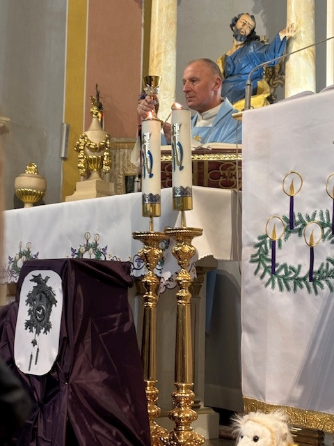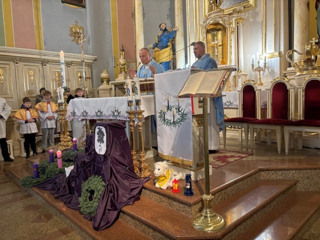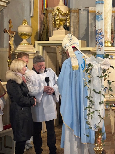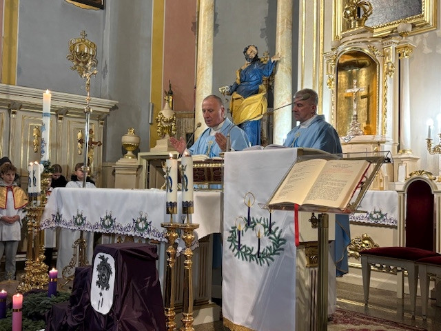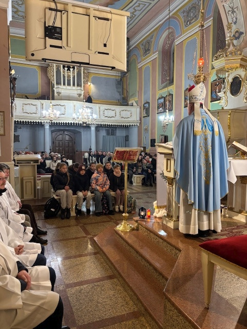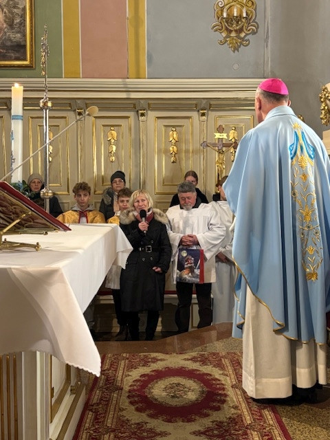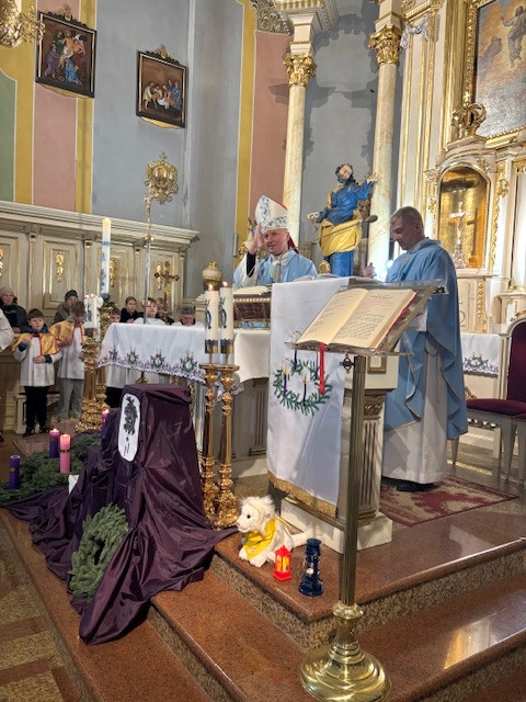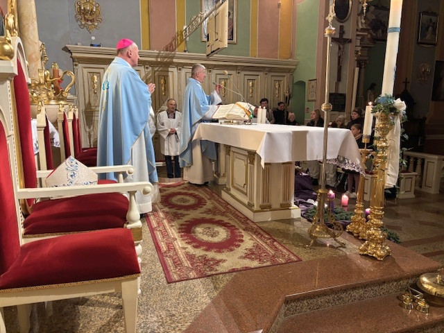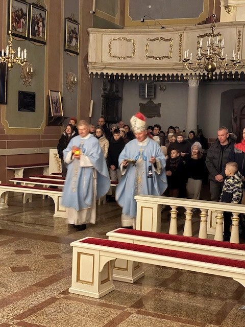 W czwartek - 18 grudnia, Mszy św. roratniej, o godz. 6.20 przewodniczył Pasterz Diecezji Radomskiej, ks. biskup Marek Solarczyk, którą odprawił w intencji całej naszej parafii. W homilii, wskazał na wyjątkową rolę św. Moniki, która wytrwałą modlitwą wyprosiła nawrócenie swojemu synowi św. Augustynowi. Biskup zachęcał nas, byśmy naśladowali ją w cierpliwej i gorliwej modlitwie. Na zakończenie Mszy św. przedstawiciele parafii Krystyna i Ryszard Piaskowi, podziękowali biskupowi Markowi za obecność i dar wspólnej modlitwy, a dzieci wraz z Pasterzem stanęły do pamiątkowego zdjęcia