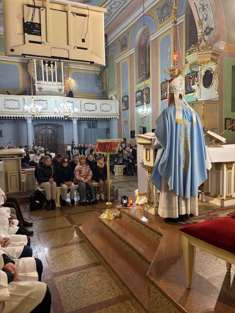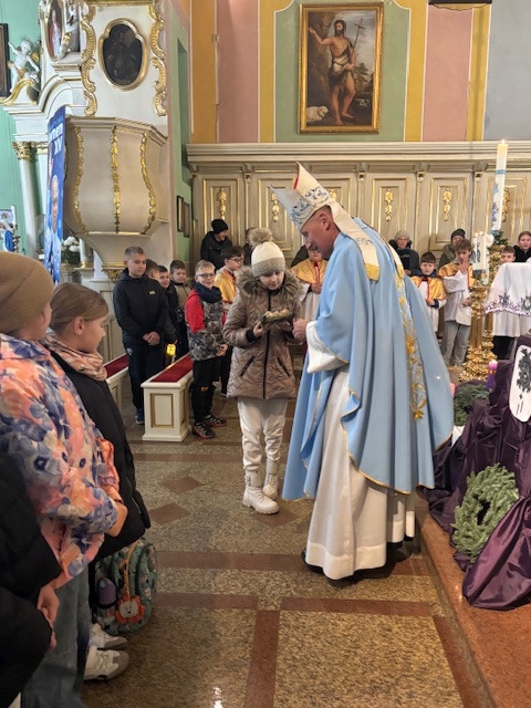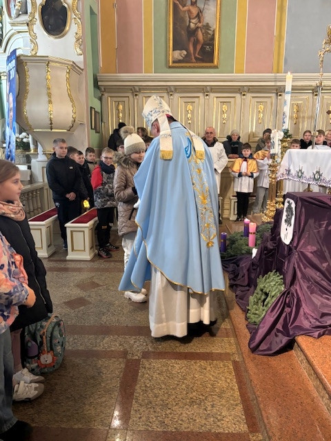 W czwartek - 18 grudnia, Mszy św. roratniej, o godz. 6.20 przewodniczył Pasterz Diecezji Radomskiej, ks. biskup Marek Solarczyk, którą odprawił w intencji całej naszej parafii. W homilii, wskazał na wyjątkową rolę św. Moniki, która wytrwałą modlitwą wyprosiła nawrócenie swojemu synowi św. Augustynowi. Biskup zachęcał nas, byśmy naśladowali ją w cierpliwej i gorliwej modlitwie. Na zakończenie Mszy św. przedstawiciele parafii Krystyna i Ryszard Piaskowi, podziękowali biskupowi Markowi za obecność i dar wspólnej modlitwy, a dzieci wraz z Pasterzem stanęły do pamiątkowego zdjęcia